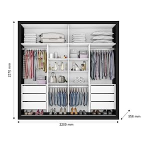 Equipado com 6 gavetas de corrediças telescópicas, 8 prateleiras versáteis, portas espelhadas, compartimentos especialmente projetados para malas e roupas de cama, e divisão interna inteligente ELE e ELA que permite uma organização personalizada e eficiente. Os cabideiros e calceiros metálicos são espaçosos e robustos, proporcionando suporte ideal para suas roupas e acessórios.