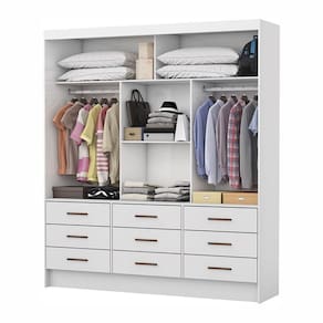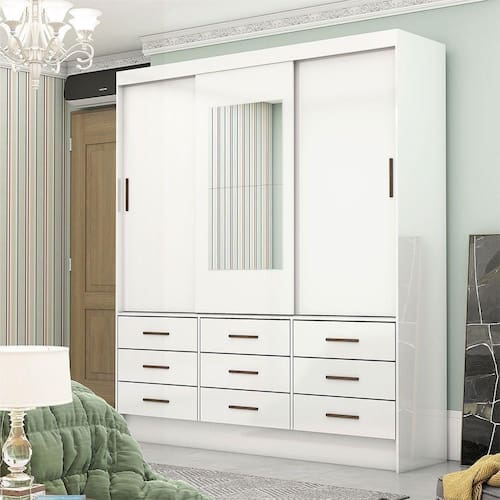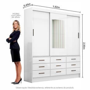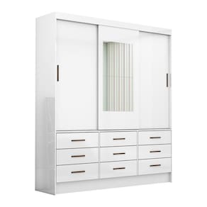 Guarda Roupa Sevilha 3pts 9gav Com Espelho Carioca Móveis Branco O Guarda-Roupa Sevilha 3 Portas com espelho 9 gavetas com 2,00 de altura, 1,62 de largura e 0,45 de profundidade, com 3 portas portas sendo a porta central espelhada e 9 gavetas externas com corredicas metalicas. Ideal para otimizar o espaco do ambiente e deixar tudo organizado.