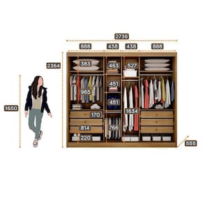 Colunada em 25mm Trilho inferior em alumínio e roldanas com amortecedores Interno ele e ela Fundo interiço Perfil puxador e batente alinhador em alumínio bronze Roldana superior com guia zero e freio Gavetas internas com puxadores e corrediças telescópicas Cabideiros e calceiros em alumínio