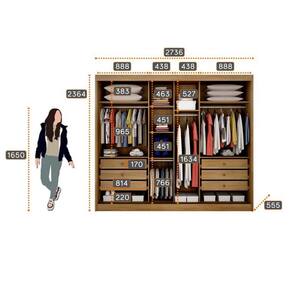 Colunada em 25mm Trilho inferior em alumínio e roldanas com amortecedores Interno ele e ela Fundo interiço Perfil puxador e batente alinhador em alumínio bronze Roldana superior com guia zero e freio Gavetas internas com puxadores e corrediças telescópicas Cabideiros e calceiros em alumínio