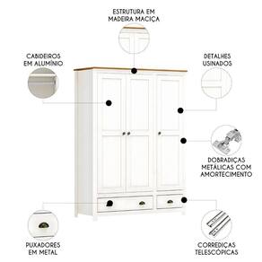 Além das gavetas, o Guarda Roupa acompanha quatro prateleiras em madeira maciça e um cabideiro de alumínio. Os puxadores metálicos em ouro envelhecido, com estilo botão nas portas e concha na gaveta, complementam o visual deixando o Quarto mais elegante.