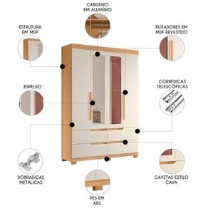 Esse Guarda Roupa Solteiro conta com quatro gavetas espaçosas, com puxadores estilo cava que proporciona um visual moderno e sofisticado. Além disso, as corrediças telescópicas garantem um deslizamento suave e sem ruídos. Na parte interna, com o cabideiro em alumínio, você terá amplo espaço para pendurar suas roupas sem se preocupar com amassados, ao passo que as diversas prateleiras são uma ótima opção para roupas que podem dobrar ou até mesmo para dispor calçados, bolsas e até itens de maquiagem. As portas possuem dobradiças metálicas que garantem a qualidade e durabilidade, sendo duas delas também com espelho para te auxiliar no dia a dia. Para completar, os pés inclusos oferecem estabilidade e durabilidade ao móvel, além de facilitar a limpeza do ambiente. O Guarda Roupa perfeito para quem busca funcionalidade aliada ao design contemporâneo.