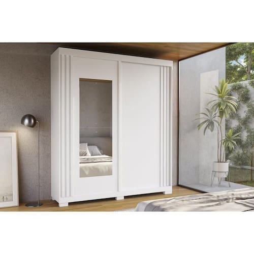 Tipo de Cabideiro - Aéreo Material dos Cabideiros - Cabideira Metálico Tipo de Porta do Guarda-Roupa - Portas de Correr Material das Portas - Portas em MDF Diferenciais das Portas - Porta c/ Espelho Quantidade de Portas - 2 Portas de Correr Quantidade de Portas com Espelho - 1 Porta com Espelho Tipo de Espelho - Espelho Externo Quantidade de Espelhos - 1 Espelho Material das Gavetas - Gavetas em MDF Tipo de Corrediça - c/ Corrediças Telescópicas Quantidade de Gavetas - 3 Diferenciais das Gavetas - c/ Divisórios Internas Tipo dos Pés - MDF Quantidade de Pés - 6 pés Material das Prateleiras - Prateleiras em MDF Quantidade de Prateleiras - 3 Quantidade de Nichos - 8 nichos