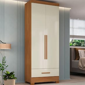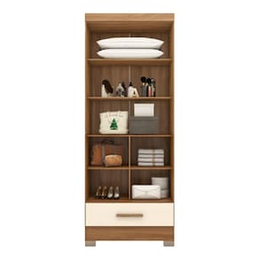 Material: MDP 15mm Portas: 2 portas de bater Gavetas: 1 gaveta externa Corrediças: Telescópicas Prateleiras: 7 prateleiras Pés: 4 pés Cabideiros: Não possui Espelhos: Não possui