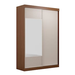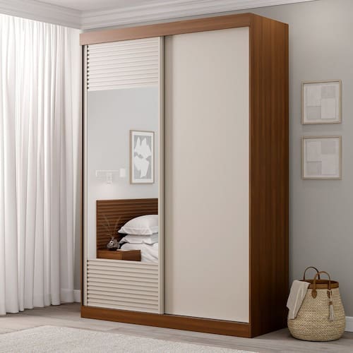 Com suas 2 portas de correr, disponíveis com ou sem espelho, e detalhes ripados em MDF que seguem as últimas tendências de design, o armário possui imponentes 163 cm de largura e 237 cm de altura, possibilitando a verticalização da sua organização. Fabricado em MDP de 15mm e MDF de 25mm em seus detalhes ripados usinados, garantindo robustez e durabilidade excepcionais. Cada detalhe foi cuidadosamente planejado para proporcionar não apenas beleza, mas também praticidade, com várias divisões internas para organização eficiente de roupas e acessórios.