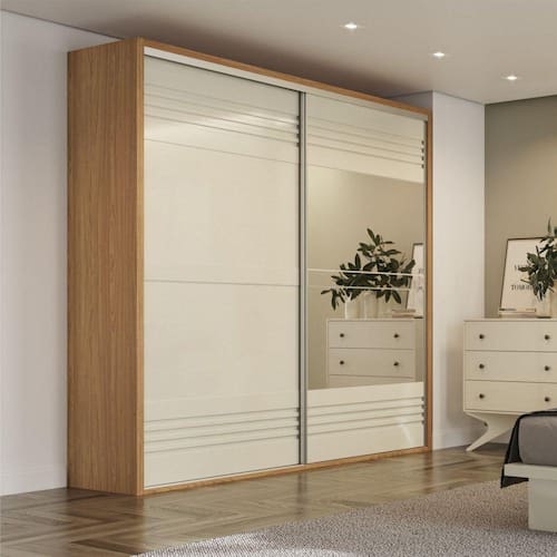 A Dalla Costa traz o roupeiro TW602E JW na cor Freijó/ Off White. Com 223 cm de largura, tem espaço de sobra para acomodar suas roupas e calçados. O Roupeiro 2 portas sendo uma de espelho possui estrutura 100% MDF, além de pintura UV, com um excelente acabamento proporcionando uma maior durabilidade ao móvel. Acabamento da Prateleira: Pintura Escala de Brilho da Prateleira: Fosco Possui Cabideiros: Sim Acabamento da Gaveta: Pintura Tipo de Corrediça: Metálica Telescópica Possui Organizador de Gaveta: Não Acabamento da Porta: Pintura Escala de Brilho da Porta: Brilhante Material do Puxador da Porta: Alumínio Altura do Espelho: 101 cm Ambiente Principal: Quarto codigo_ean: 7908506259225 Complexidade da Montagem: Média: pode ser montado por mais de uma pessoa e/ou necessite de maior conhecimento para montagem Cor: Freijó/Off White Cor do Produto: Freijó/Off White Cor Interna: Off White Escala de Brilho: Fosco Espessura do Espelho: 3 mm Formato do Espelho: Quadrado Itens Inclusos: 1 Guarda Roupa, Kit Ferragens e Manual de Montagem Largura do Espelho: 63 cm Manual de Montagem e Instalação: https://product-hub-prd.madeiramadeira.com.br/693775/documents/d1f55e93-99cc-4610-b3fe-cff7e2c0c37d824992tw601602603portas.pdf Material da Gaveta: MDF Material da Porta: MDF Material da Prateleira: MDF Material Principal: MDF Necessita Montagem: Sim Origem do Produto: Nacional Peso: 233,9 kg Peso Máximo por Gaveta: 5 kg Peso Máximo por Prateleira: 10 kg Possui Calceiros: Não Possui Espelho: Sim Possui Pés: Não Possui Portas: Sim Possui Prateleiras: Sim Produto Montado: Sim Quantidade de Espelho: 02 Espelhos com Tamanhos Diferentes Quantidade de Gavetas: 02 Gavetas Recomendações de Uso, Manutenção e Limpeza: Utilizar somente um pano levemente umedecido e em seguida passe um pano seco. Produtos químicos ou abrasivos podem acabar danificando o acabamento do móvel. Sistema de Montagem: Minifix, Parafusos e Porcas Tipo de Corrediça da Gaveta: Metálica Telescópica Tipo de Dobradiça/Corrediça da Porta: Metálica Tipo de Fixação do Espelho: Silicone Tipo de Gaveta: Interna Tipo de Guarda-Roupa: Solteiro Tipo de Puxador da Gaveta: Não Possui Tipo de Puxador da Porta: Embutido