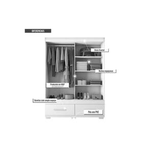 Material dos Cabideiros - Cabideira Metálico Tipo de Porta do Guarda-Roupa - Portas de Correr Material das Portas - Portas em MDP Quantidade de Portas - 2 Portas de Correr Quantidade de Portas com Espelho - 1 Porta com Espelho Tipo de Espelho - Espelho Externo Quantidade de Espelhos - 1 Espelho Material das Gavetas - Gavetas em MDP Tipo de Corrediça - c/ Corrediças Metálicas Quantidade de Gavetas - 2 Gavetas Material de Estrutura Fundo Gaveta - Em HDF Tipo dos Pés - ABS/PVC Quantidade de Pés - 6 pés Material das Prateleiras - Prateleiras em MDP Quantidade de Prateleiras - 3