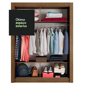 Pensado na medida certa para quarto de solteiro, possui espaço interno muito bom, com duas prateleiras e quatro nichos, além de um cabideiro de metal resistente e de tamanho diferenciado, 105 cm. Tem espaço para roupas longas, roupas mais curtas, malas, acessórios e muito mais.