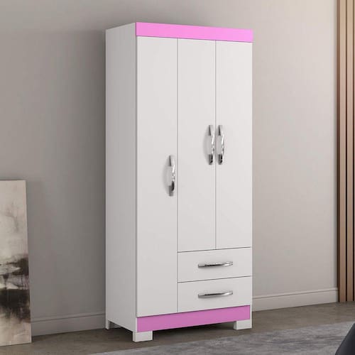 O roupeiro com 3 portas e 2 gavetas, sendo as gavetas com corrediça metálica, 3 prateleiras internas, possui 4 pesinhos, um cabideiro, puxador das gavetas e portas em plástico, produto ideal para quem está procurando algo para espaços pequenos porém com boa distribuição de espaço. Acabamento da Prateleira: Impressão Escala de Brilho da Prateleira: Semi-Brilho Possui Cabideiros: Sim Acabamento da Gaveta: Impressão Escala de Brilho da Gaveta: Semi-Brilho Material do Puxador da Gaveta: Plástico Possui Organizador de Gaveta: Não Acabamento da Porta: Impressão Escala de Brilho da Porta: Semi-Brilho Material do Puxador da Porta: Plástico Altura dos Pés: 5 cm Altura Máxima dos Pés: 5.0000 codigo_ean: 7898604855194 Complexidade da Montagem: Alta: deve ser montado por um montador especializado Cor: Branco New/Rosa Cor do Produto: Branco New/Rosa Cor Interna: Branco Escala de Brilho: Fosco Itens Inclusos: 1 Guarda Roupa e Manual de Montagem. Manual de Montagem e Instalação: https://product-hub-prd.madeiramadeira.com.br/535798/documents/d66f11c8-e9b2-4085-9dc4-6303a9183df5455059nt5000.pdf Material da Gaveta: MDP Material da Porta: MDP Material da Prateleira: MDP Material dos Pés: Plástico Material Principal: MDP Necessita Montagem: Sim Origem do Produto: Nacional Peso: 48,2 kg Peso Máximo por Gaveta: 3 kg Peso Máximo por Prateleira: 5 kg Possui Calceiros: Não Possui Espelho: Não Possui Pés: 04 Possui Portas: Sim Possui Prateleiras: Sim Produto Montado: Sim Quantidade de Gavetas: 02 Gavetas Quantidade de Prateleiras: 03 Prateleiras Recomendações de Uso, Manutenção e Limpeza: Para maior durabilidade, recomenda-se que a limpeza do móvel seja feita da seguinte forma: Nas partes externas (portas, laterais e frente da gaveta) e internas, a limpeza deverá ser feita com pano limpo e levemente umedecido em água e sabão neutro. Em seguida, utilizar um pano limpo e seco. Sistema de Montagem: Parafusos e Minifix. Suporta Até (kg): 38 kg Tipo de Corrediça da Gaveta: Metálica Simples Tipo de Dobradiça/Corrediça da Porta: Aço Tipo de Guarda-Roupa: Solteiro Tipo de Madeira Maciça: Pinus Tipo de Madeira Maciça da Gaveta: Pinus Tipo de Madeira Maciça da Porta: Pinus Tipo de Madeira Maciça da Prateleira: Pinus Tipo de Puxador da Gaveta: Externo Tipo de Puxador da Porta: Externo