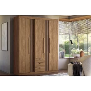 Material do Calceiro - Calceiro Metálico Tipo de Cabideiro - Aéreo Material dos Cabideiros - Cabideira Metálico Tipo de Porta do Guarda-Roupa - Portas de Bater Material das Portas - Portas em MDP Tipo de Dobradiças - Dobradiças Metálicas Diferenciais das Portas - Portas Ripadas Quantidade de Portas - 3 Portas de Abrir Material das Gavetas - Gavetas em MDP Tipo de Corrediça - c/ Corrediças Telescópicas Quantidade de Gavetas - 3 Material de Estrutura Fundo Gaveta - Em HDF Material das Prateleiras - Prateleiras em MDP Quantidade de Prateleiras - 5