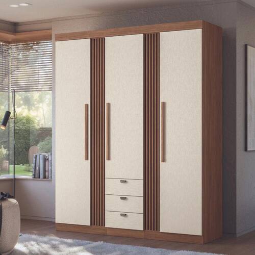 O Guarda Roupa Solteiro 3 Portas 3 Gavetas Ripado Aurora Santos Andirá, é um móvel sofisticado com três portas amplas de abrir, projetado para atender aos padrões mais exigentes em funcionalidade e espaço. Com um design de alta qualidade e extrema beleza, este roupeiro é uma escolha refinada. Equipado com três gavetas externas que deslizam suavemente em corrediças telescópicas, e puxadores pontuais em ABS, já as portas apresentam puxadores em MDF revestidos. Internamente, o roupeiro conta com três cabideiros/calceiros em alumínio para melhor organização.