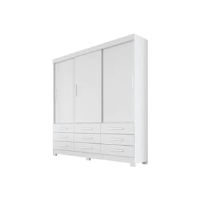 Particularidades do guarda-roupa: Características: - 100% MDP; - Puxadores com acabamento amadeirado; - 9 Gavetas com corrediças telescópicas; - Trilho inferior em alumínio; - Roldanas com rolamento; - Cabideiros em alumínio; - Pés inclusos;
