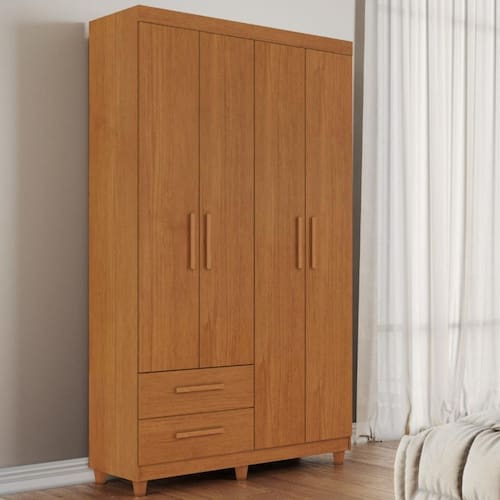 O Guarda Roupa Solteiro com Pés 4 Portas 2 Gavetas Plus Conquista Móveis, uma peça de mobiliário que combina elegância, funcionalidade e consciência ambiental em um só lugar. Seu revestimento em Pintura UV, protegido com verniz ultra resistente, ressalta sua beleza de forma duradoura. Com duas gavetas equipadas com corrediças telescópicas, este guarda-roupa oferece uma organização interna cuidadosamente planejada. Contando com um cabideiro longo em madeira, cinco prateleiras e espaço dedicado para sapatos, ele proporciona ampla capacidade de armazenamento, mantendo o ambiente sempre arrumado e sofisticado.