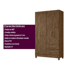 Material: MDP | Cor: Branco | Cômodo Indicado: Quarto | Dimensões do Guarda Roupa (A X L X P): A 1,82 x L 1,03 x P 0,47 | Puxadores: PVC | Quantidade de Gavetas: 2 | Quantidade de Portas: 4 | Possui Pés: Sim | Tipo de Guarda Roupa: Solteiro | Garantia do Fabricante: 3 Meses | Modelo: Chile | Peso Total: 58 Kg | Altura do Produto com embalagem (cm): 182 | Peso do Produto (Kg): 57.59 | Largura Produto com embalagem (cm): 103 | Instruções/Cuidados: Evite contato com líquidos. Nada de lavar os móveis. Móveis não gostam de umidade. Não deixe o móvel exposto ao sol. Os acessórios também precisam de limpeza. | Produto precisa de Montagem?: Sim, a montagem é simples mas sugerimos a contratação do nosso serviço de montagem (para os CEPs em que o serviço está disponível) ou de algum profissional experiente de sua preferência | Material para Filtro: MDP | Estado de Origem: PR | Conteúdo da Embalagem: Guarda Roupa Solteiro 4 portas 2 gavetas Chile | Altura do Produto (cm): 182 | Comprimento do Produto (cm): 47 | Largura do Produto (cm): 103 | Descrição do Tamanho: 47x103x182 cm | Nome do Simples no Fornecedor: Guarda Roupa Solteiro 4 portas 2 gavetas Chile | Comprimento Produto Com Embalagem (cm): 47 | Peso Produto Com Embalagem (Kg): 57.59 Cor: Castanho Wood