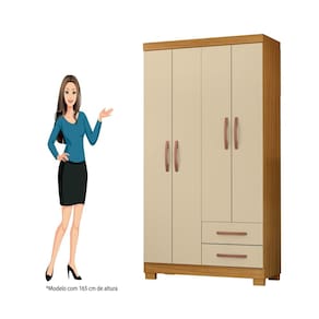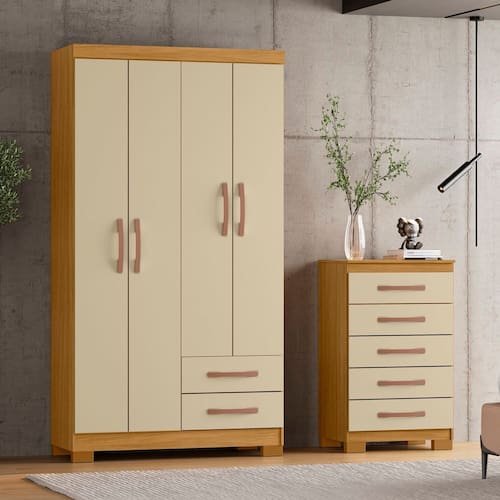 O Guarda-Roupa Casal 4 Portas 2 Gavetas mede 187 cm de altura, 100 cm de largura e 42,5 cm de profundidade. Produzido 100% em MDP, oferece resistência e durabilidade. Possui cabideiro em madeira e duas gavetas com corrediças telescópicas, garantindo abertura suave, maior aproveitamento interno e organização eficiente de roupas dobradas e peças longas. Conta com pintura UV texturizada, que aumenta a resistência a riscos e desgaste diário, preservando o acabamento por mais tempo.