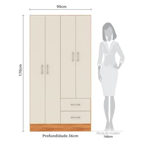 Conta com 4 portas de bater com dobradiças metálicas, 2 gavetas com corrediças plásticas e 2 cabideiros de madeira revestidos na cor cinza, ideais para acomodar roupas curtas e longas. Possui também 1 prateleira interna para melhor organização.