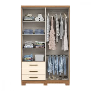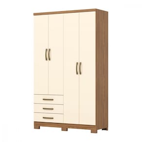 Características: Cabideiro de madeira revestido Gavetas com corrediças metálicas Pés em ABS Puxadores em ABS Estrutura em 12 e 15mm 4 Portas 3 Gavetas Prateleira suporta até 8kg Gaveta suporta até 3kg 1 Calceiro