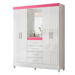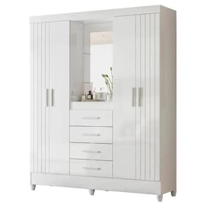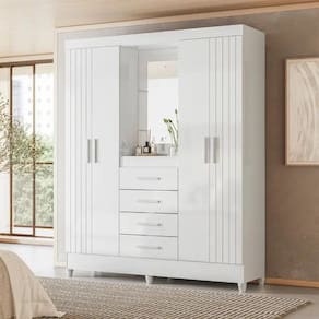 Sao 4 portas, sendo 2 com frisos decorativos, que trazem sofisticacao imediata ao quarto. No centro, a charmosa capelinha com espelho e prateleira funciona como destaque do movel ideal para perfumes, acessorios e itens especiais. Um detalhe que faz toda a diferenca no visual.