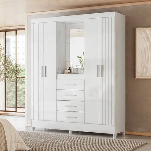 Sao 4 portas, sendo 2 com frisos decorativos, que trazem sofisticacao imediata ao quarto. No centro, a charmosa capelinha com espelho e prateleira funciona como destaque do movel ideal para perfumes, acessorios e itens especiais. Um detalhe que faz toda a diferenca no visual.