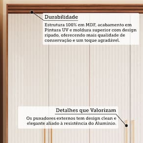 Transforme seu quarto com o Roupeiro Lumiar, a união perfeita entre sofisticação e funcionalidade. Com um design marcante, ele apresenta eestrutura 100% em MDF com detalhe ripado e elegantes puxadores grandes que elevam o visual do ambiente. Sua estrutura posui acabamento UV, garantindo mais durabilidade. Oferece excelente aproveitamento de espaço interno, com destaque funcional para as gavetas com "puxadores" no estilo cava usinada e corrediças telescópicas, proporcionando uma abertura total e um deslizar suave e silencioso. O Guarda-Roupa Lumiar é a escolha ideal para quem não abre mão de organização, estilo e alta qualidade.