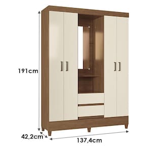 Guarda Roupa Solteiro 4 portas com pés Capelinha Fit Jequitibá Off: O Capelinha Fit é versátil e pensado para aproveitar ao máximo o quarto: tem cabideiros, gavetas, penteadeira com espelho e prateleiras que ajudam na rotina. Acabamento brilhante e puxadores em tom dourado dão um toque sofisticado.