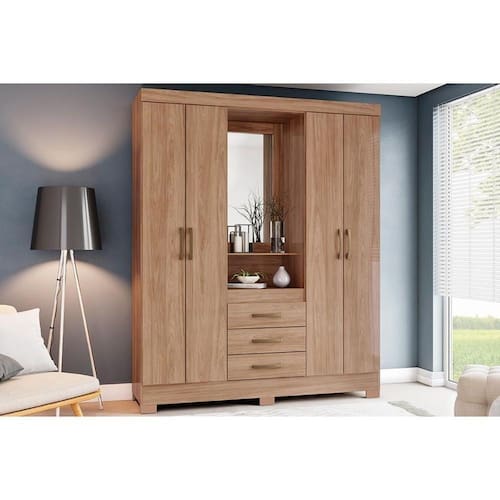 Guarda Roupa Solteiro 4 Portas e 3 Gavetas c/ Espelho Briz B24 Jequitibá Brilho - Henn