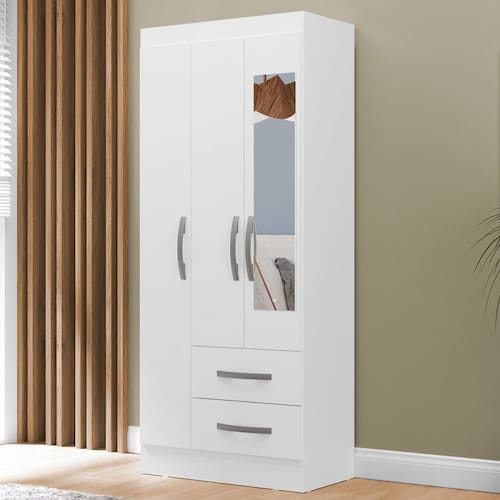 O(a) Guarda-Roupa Solteiro Adolfo 3 Portas 2 Gavetas com Espelho Branco - Mx Móveis é produzido em MDP na escala de brilho Alto Brilho, e possui um grau de dificuldade de montagem: Médio.