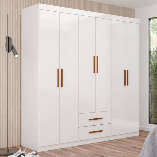 O(a) Guarda-Roupa Solteiro Aurora 6 Portas 2 Gavetas Branco - Carioca Móveis é produzido em MDP na escala de brilho Fosco e Semi-Brilho, e possui um grau de dificuldade de montagem: Médio.