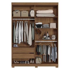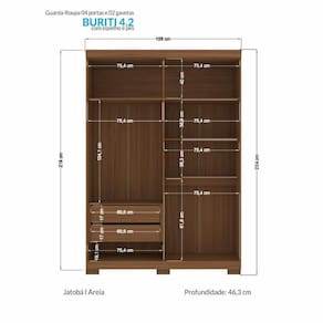 O Guarda-Roupa Buriti possui um design diferenciado e atemporal. São 4 portas, sendo 2 delas em MDF e com detalhe usinado ripado e puxadores pontuais em ABS para abertura. As demais portas em MDP seguem com puxadores em MDF revestido em formato grande. Internamente, possui 5 amplas prateleiras com muito espaço para guardar os pertences, 2 cabideiros em alumínio de excelente qualidade para pendurar as roupas, 2 gavetas com corrediças telescópicas que suportam muito mais peso, compartimento para guardar pertences de valor. Externamente, o acabamento é em textura Reverse semi fosco, suave ao toque, e que facilita a limpeza.