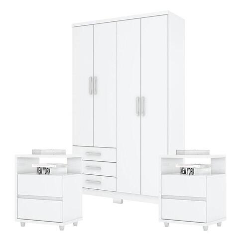 Guarda Roupa Solteiro Caju 4 Portas com Kit Mesa de Cabeceira Campeche Branco - Henn