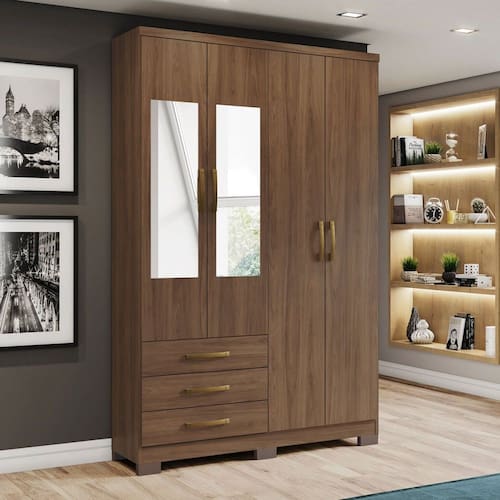 O(a) Guarda-Roupa Solteiro Caju 4 Portas e 3 Gavetas com Espelho Castanho - Henn é produzido em MDP na escala de brilho Brilho e Fosco, e possui um grau de dificuldade de montagem: Médio.