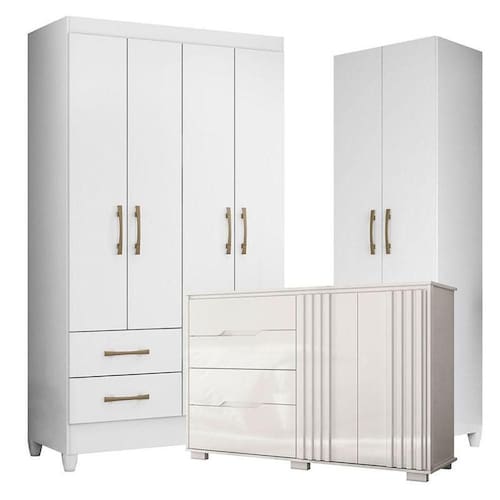 Guarda Roupa Solteiro Chile com Cômoda Texas e Armário Multiuso New Íris Branco Brilho Moval