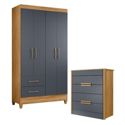 Organize seu quarto com elegância e o melhor custo benefício do mercado. Apresentamos o Guarda Roupa Solteiro Chile e Cômoda Dhara fabricados pela Moval. Guarda Roupa com 04 portas e 02 gavetas com corrediças metálicas, puxadores na cor bronze, cabideiro para melhor organização interna, espaço ideal para roupas longas e pés em PVC. A cômoda possui 04 gavetas com corrediças telescópicas, moldura lateral de 25mm, tampo de 15mm, puxadores em MDF, pés em PVC e um design moderno que combina com qualquer decoração. Fabricado com materiais de alta qualidade que garante resistência e durabilidade ao produto. Confira mais detalhes e aproveite!