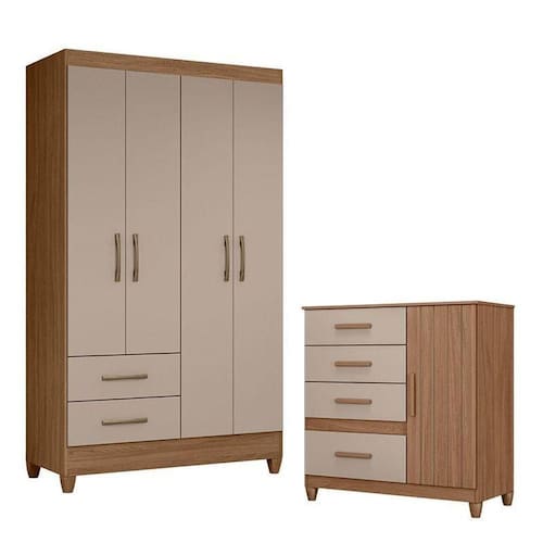 Organize seu quarto com elegância e o melhor custo benefício do mercado. Apresentamos o Guarda Roupa Solteiro Chile e Cômoda Vênus fabricados pela Moval. Guarda Roupa com 04 portas e 02 gavetas com corrediças metálicas, puxadores na cor bronze, cabideiro para melhor organização interna, espaço ideal para roupas longas e pés em PVC. A cômoda possui 04 gavetas com corrediças metálicas, 01 porta com detalhe frisado, puxadores em MDF na cor bronze, pés em PVC e um design moderno que combina com qualquer decoração. Fabricado com materiais de alta qualidade que garante resistência e durabilidade ao produto. Confira mais detalhes e aproveite!