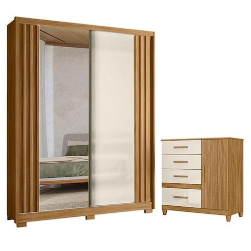 Está montando seu quarto? Apresentamos para você este belo conjunto composto pelo guarda roupa da linha Colorado e a cômoda da linha Vênus. O guarda roupa possui duas portas deslizantes com detalhe ripado em MDF, sendo uma porta com espelho, três gavetas internas com corrediças telescópicas. Complementando o conjunto, a cômoda oferece praticidade com quatro gavetas equipadas com corrediças metálicas e uma porta com detalhe frisado. Assim como o guarda roupa, a cômoda possui pés em PVC, entregando mais durabilidade e estabilidade. Fabricados pela Moval, são desenvolvidos em MDP, ideal para quem está procurando design moderno, funcional e acabamentos refinados para organizar suas roupas e acessórios. Aproveite e garanta já o seu!