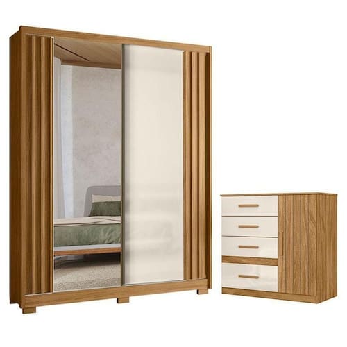 Está montando seu quarto? Apresentamos para você este belo conjunto composto pelo guarda roupa da linha Colorado e a cômoda da linha Vênus. O guarda roupa possui duas portas deslizantes com detalhe ripado em MDF, sendo uma porta com espelho, três gavetas internas com corrediças telescópicas, além dos pés em PVC. Complementando o conjunto, a cômoda oferece praticidade com quatro gavetas equipadas com corrediças metálicas e uma porta com detalhe frisado. Fabricados pela Moval, são desenvolvidos em MDP, ideal para quem está procurando design moderno, funcional e acabamentos refinados para organizar suas roupas e acessórios. Aproveite e garanta já o seu!