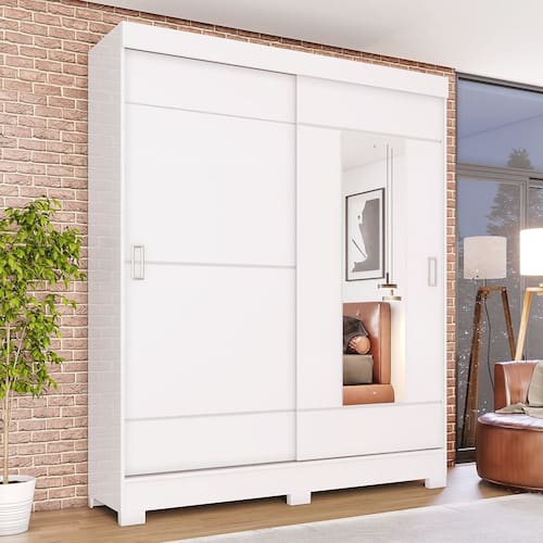 FICHA TÉCNICA: Acabamento: Nas versões Preto HP e Nature/Cinza a Pintura é UV Texturizada, na versão Castanho/Off White e Branco/Rosa Chá a Pintura é UV Texturizada/Pintura UV e na versão Branco a Pintura é UV Cor Interna: Nas versões Nature/Cinza, Preto HP e Castanho/Off White é Trama e na versão Branco/Branco com Rosa Chá é Trama Branco Escala de Brilho: Nas versões Preto HP, Nature/Cinza, Rosa Chá e Castanho é Fosco e na versão Branco é Brilho Material do Fundo: MDF Possui Espaço para Vestidos Longos: Não Possui Ganchos: Não Possui Iluminação Led: Não Possui Maleiro: Sim Possui porta Objetos: Não Qtd. Portas: 2 Und. Tipo Porta: Correr Material da Porta: MDP Material do Puxador Porta: ABS Qtd. Gavetas: 2 Und. Material da Gaveta: MDP Material da Corrediça: Metálica Peso Máximo por Gaveta: 3 KGs Possui Organizador de Gaveta: Não Qtd. Prateleiras: 3 Und. Material da Prateleira: MDP Peso Máximo por Prateleira: 8 KGs Possui pés: 6 Und. Material dos Pés: ABS Altura Pés/Rodapés: 5 Cm Pés Reguláveis: Não Possui Espelho: Sim Medida do Espelho: 125 X 35 X 0,3 Cm Possui Vidro: Não Produto Suporte até -Kg-: 62 Kg Material Principal: MDP Medidas Montado: 200 x 163 x 48,5 Cm Peso Montado: 90 Kg