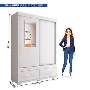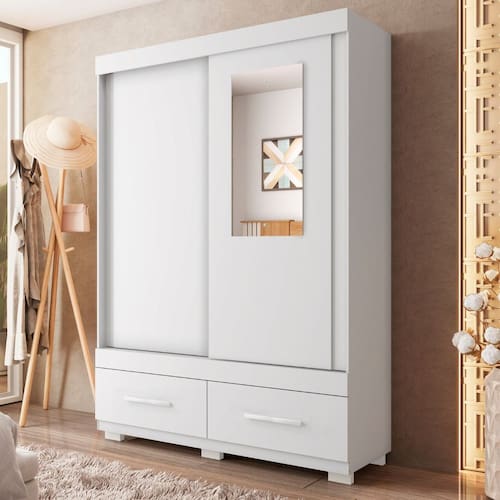 O Roupeiro Sereno da Caemmun é a escolha perfeita para quem busca um móvel prático, durável e com design moderno. Com 1.36 m de largura, ele se adapta perfeitamente a diversos ambientes. Produzido em MDP de alta qualidade com acabamento FF, o Roupeiro Sereno oferece resistência e durabilidade. Com duas portas de correr que deslizam suavemente e duas gavetas que garantirá a organização das roupas, acessórios e objetos pessoais. Escolha a tonalidade que mais combina com seu ambiente e estilo. Acabamento da Prateleira: BP Melamínico Escala de Brilho da Prateleira: Fosco Possui Cabideiros: Sim Acabamento da Gaveta: BP Melamínico Possui Organizador de Gaveta: Não Acabamento da Porta: BP Melamínico Escala de Brilho da Porta: Fosco Altura do Espelho: 70 cm Altura dos Pés: 5 cm Altura Máxima dos Pés: 5.0000 Ambiente Principal: Quarto codigo_ean: 7909903986653 Complexidade da Montagem: Alta: deve ser montado por um montador especializado Cor: Branco Cor do Produto: Branco Escala de Brilho: Fosco Espessura da Estrutura (mm): 12 mm Espessura das Portas (mm): 12 mm Espessura das Prateleiras (mm): 12 mm Espessura do Espelho: 3 mm Espessura do Fundo (mm): 2,5 mm Espessura do Fundo das Gavetas (mm): 2,5 mm Formato do Espelho: Retangular Itens Inclusos: 1 Guarda Roupa, Kit ferragens e Manual de Montagem Largura do Espelho: 35 cm Linha ou Coleção: Sereno Manual de Montagem e Instalação: https://product-hub-prd.madeiramadeira.com.br/938919/documents/3722df3f-ebc9-43da-9b2c-f237f7f419a52307242559517256277692022.pdf Marca: Caemmun Material da Gaveta: MDP/HDF Material da Porta: MDP Material da Prateleira: MDP Material dos Pés: Plástico Material Principal: MDP modular: Não Montagem Flex: Não Necessita Montagem: Sim Nicho com Cabideiro: Não Origem do Produto: Nacional Peso: 67,71 kg Peso Máximo por Gaveta: 2 kg Peso Máximo por Prateleira: 5 kg Possui Calceiros: Não Possui Espelho: Sim Possui Pés: 06 Possui Portas: Sim Possui Prateleiras: Sim Produto Montado: Sim Quantidade de Cabideiros: 01 Cabideiro Quantidade de Espelho: 01 Quantidade de Gavetas: 02 Gavetas Recomendações de Uso, Manutenção e Limpeza: Limpar com pano macio levemente umedecido e em seguida pano macio seco. Não utilizar produtos abrasivos (lixas, esponjas) e/ou produtos a base de solventes (thinner, aguarrás). Sistema de Montagem: Utiliza-se na montagem do produto sistema de fixação minifix, dobradiças, dispositivos angulares, cavilhas, parafusos, porcas cilindricas, entre outros; Tipo de Corrediça da Gaveta: Metálica Simples Tipo de Dobradiça/Corrediça da Porta: Plástica Tipo de Fixação do Espelho: Parafusos Tipo de Gaveta: Externa Tipo de Guarda-Roupa: Solteiro Tipo de Puxador da Gaveta: Externo Tipo de Puxador da Porta: Externo
