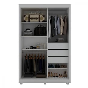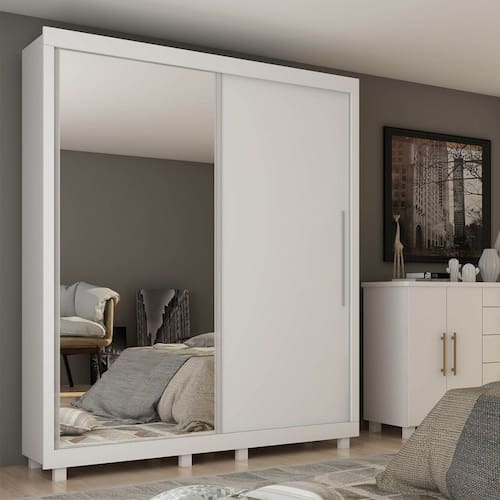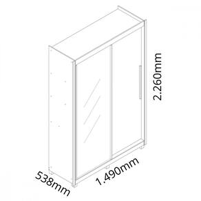 Caracteristicas: Estrutura em MDP e MDF 2 Portas de correr Espelho em uma das portas Trilhos em MDF e aluminio 3 Gavetas Corredicas telescopicas Puxadores em aluminio e MDF 4 Prateleiras Cabideiro Espaco para calcados Pes de madeira