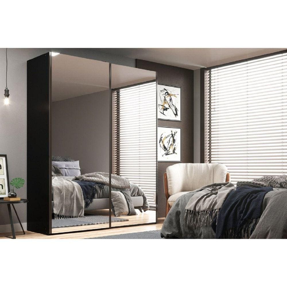 Guarda Roupa Solteiro com Espelho 2 Portas 1 Gaveta Capri Marafon Móveis Nogueira/Preto