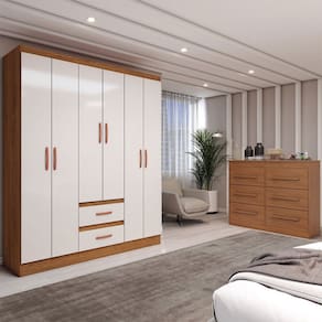 O(a) Guarda-Roupa Solteiro Europa 6 Portas 2 Gavetas com Cômoda 6 Gavetas Cinamomo/Off White - Loja é produzido em MDF e MDP na escala de brilho Semi-Brilho, e possui um grau de dificuldade de montagem: Médio.