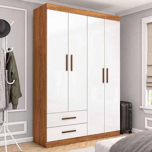 O(a) Guarda-Roupa Solteiro Genova 4 Portas 2 Gavetas Cinamomo/Branco - Carioca Móveis é produzido em MDP na escala de brilho Fosco e Semi-Brilho, e possui um grau de dificuldade de montagem: Médio.
