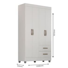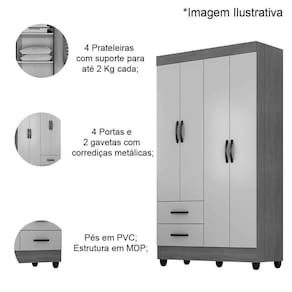 - Não nos responsabilizamos pela montagem dos produtos. Todos os produtos acompanham acessórios para que sejam montados.; - Não nos responsabilizamos, no ato da , por subir escadas/elevadores ou por guincho em apartamentos.; - Eventuais despesas são de responsabilidade do comprador; - Confira as dimensões deste produto e certifique-se de que passará normalmente por supostos elevadores, portas, escadas e/ou corredores de sua residência; - Não aceitamos de produtos com caixas violadas ou materiais danificados, confira a quantidade de volumes e se o que está sendo entregue corresponde com a mercadoria adquirida, não aceitamos após o prazo de arrependimento de 7 dias corridos. Características Gerais do Produto: - Altura: 181 cm - Gavetas: 2 Gavetas com corrediças metálicas - Ideal para: Quarto - Informações Adicionais: Possui 4 prateleiras internas; Não acompanha objetos de decoração nem roupas; - Largura: 100,6 cm - Material: MDP - Pintura: Pés e puxadores em PVC; - Portas: 4 Portas - Profundidade: 40 cm - Tipo de Porta: Porta de Bater - Acabamento: Pintura UV velluto - Informações Adicionais: - Não nos responsabilizamos pela montagem dos produtos. Todos os produtos acompanham acessórios para que sejam montados.; - Não nos responsabilizamos, no ato da , por subir escadas/elevadores ou por guincho em apartamentos.; - Eventuais despesas são de responsabilidade do comprador; - Confira as dimensões deste produto e certifique-se de que passará normalmente por supostos elevadores, portas, escadas e/ou corredores de sua residência; - Não aceitamos de produtos com caixas violadas ou materiais danificados, confira a quantidade de volumes e se o que está sendo entregue corresponde com a mercadoria adquirida, não aceitamos após o prazo de arrependimento de 7 dias corridos.