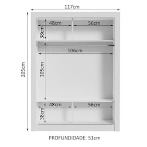 Medidas totais do guarda-roupa: 205 cm de altura x 117 cm de largura x 51 cm de profundidade.