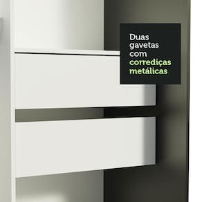 Internamente, contempla duas gavetas com corrediças metálicas, diversas prateleiras e nichos, além de dois cabideiros de madeira com espaço para roupas longas e curtas. A profundidade maior é um grande diferencial.