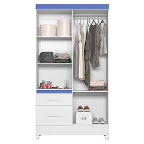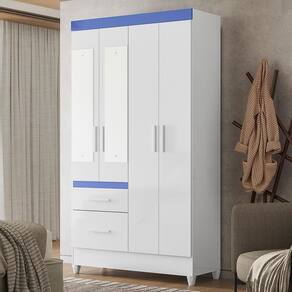 Guarda Roupa Solteiro Madri 4 Portas E 2 Gavetas Flex Branco/azul Com Espelho - Moval Branco/azul Guarda Roupa Solteiro Madri 4 Portas e 2 Gavetas com Espelho - Moval O Guarda-Roupa Solteiro Madri 4 Portas e 2 Gavetas é ideal para quem busca praticidade e organização em um único móvel. Fabricado em MDP com pintura UV, oferece resistência e acabamento de alta qualidade. Possui quatro portas com dobradiças metálicas, garantindo fácil acesso ao interior, que conta com prateleira para melhor distribuição dos itens. As duas gavetas com corrediças metálicas proporcionam espaço extra para organização, enquanto o cabideiro em alumínio mantém as roupas sempre bem acomodadas. Os puxadores em MDF e os pés em PVC conferem estabilidade e um design moderno ao guarda-roupa. ESPECIFICAÇÕES: - Estrutura em MDP - Pintura UV - 4 Portas - Dobradiças metálicas - Prateleira interna - 2 Gavetas - Corrediças metálicas - Cabideiro em alumínio - Espelho em 2 portas - Puxadores em MDF - Pés em PVC