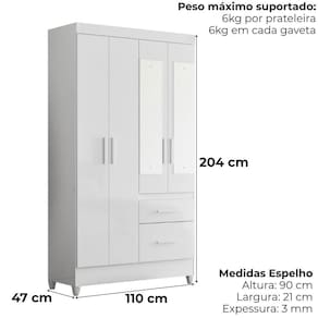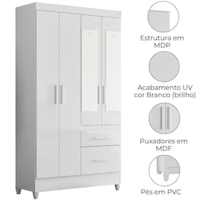 Com design inteligente para valorizar qualquer ambiente, o Guarda-Roupa Solteiro Madri oferece praticidade e organização no dia a dia. Estrutura em MDP (15/ 12 mm) e acabamento em pintura UV. Composto por portas com dobradiças metálicas (sendo 2 com espelho), cabideiro interno (alumínio), prateleiras e gavetas com corrediças metálicas. Produto com dupla opção de montagem: pés em PVC ou sapatas plásticas (2 mm) conforme preferência do cliente. Este produto será entregue em 02 volumes.