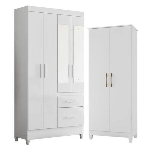 Guarda Roupa Solteiro Madri com Espelho e Armário Multiuso Jade Branco Brilho Moval