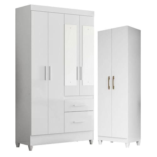 Transforme seu quarto com praticidade, estilo e o melhor custo beneficio do mercado. Apresentamos o Guarda Roupa Solteiro Madri e Armário Multiuso New Íris fabricados pela Moval. Guarda Roupa 04 portas, sendo duas com espelho, 02 gavetas com corrediças metálicas, puxadores em MDF, cabideiros em alumínio para melhor organização interna e pés em PVC. O Armário Multiuso possui 02 portas, quatro prateleiras internas, cantoneira metálica para fixação na parede, puxadores na cor bronze, pés em PVC e um design moderno que combina com qualquer decoração. Fabricado com materiais de alta qualidade que garante resistência e durabilidade ao produto. Confira mais detalhes e aproveite!