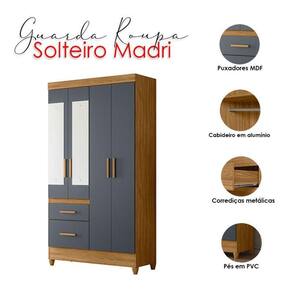 Guarda Roupa Solteiro Madri com espelho e Cômoda Dhara Freijó Cinza Moval
